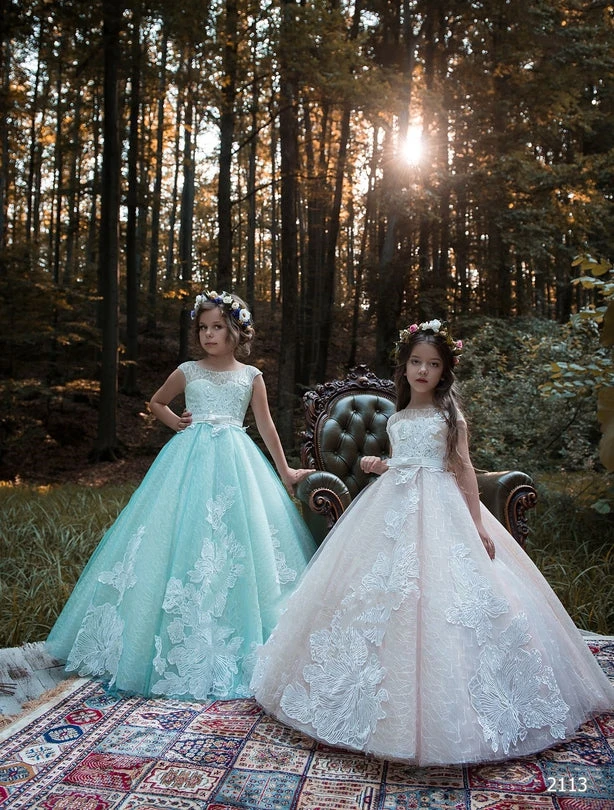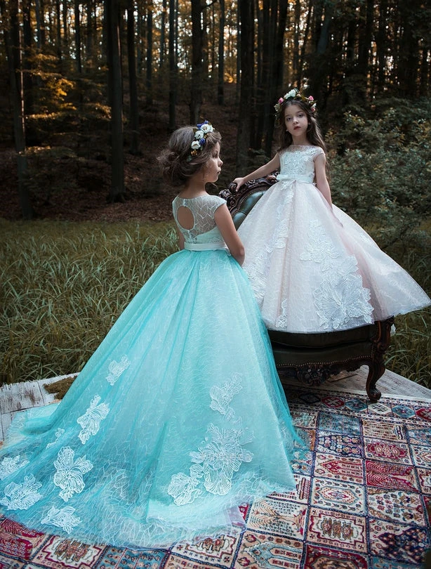 The Malta Flower Girl Dress For Wedding by MB Boutique Canada. This lovely formal dress is a Malta dress for flower girls. The dress features a scoop neckline, A-line silhouette, sleeveless, sheer lace bodice is adorned with floral lace appliques spilling gracefully over the natural waist of the gown. The bottom is a long multilayered richly gathered lace and tulle skirt. A pretty lace appliques at waist adds a touch of elegance to this stunning flower girls dress.