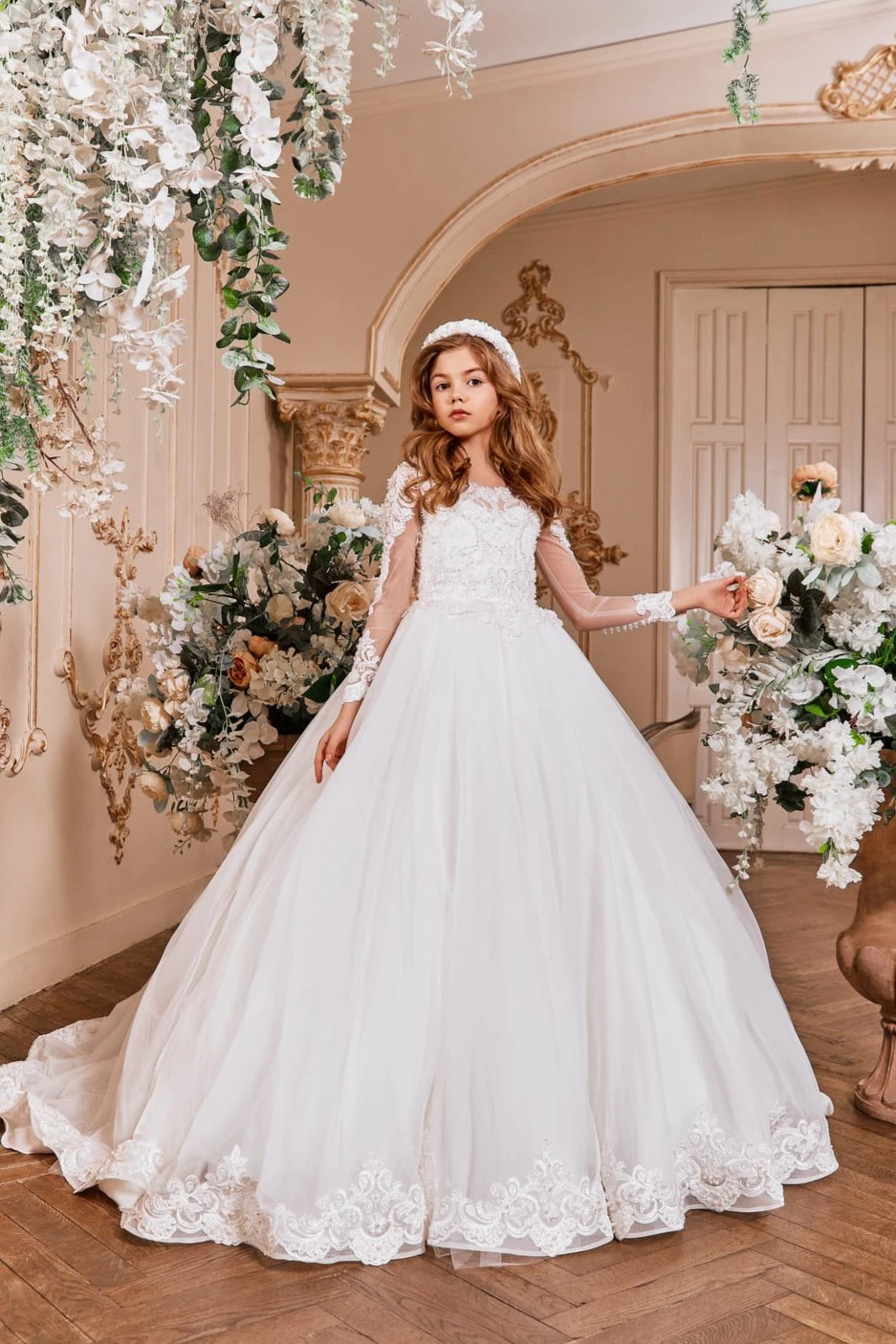 The Modena Flower Girl Dress For Wedding by Mia Bambina Boutique Canada. A beautiful Modena dress will make your little girl look like a princess. This gown features long sleeves with a fitted lace illusion bodice. A rhinestones and pearl embroidery all over the bodice. There are lace appliques on the bottom of the skirt. The illusion back bodice is adorned with a row of covered summarys over the hidden corset lacing. The dress is completed with a short train.