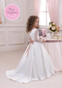 Enhance your little girl’s special day with our Modest First Communion Dresses in Organza. Featuring a flowy organza dress with a corset bodice and bishop lantern long sleeves, this dress will accentuate her angelic appearance. The high neckline with a tie bow in the back and beaded belt add an elegant touch.