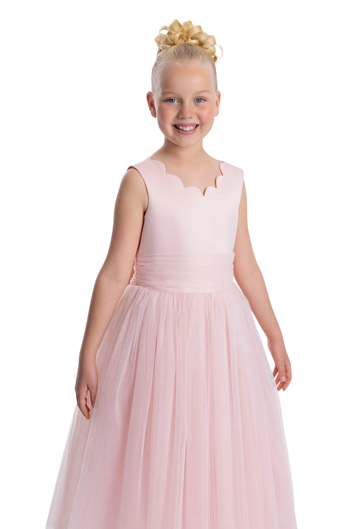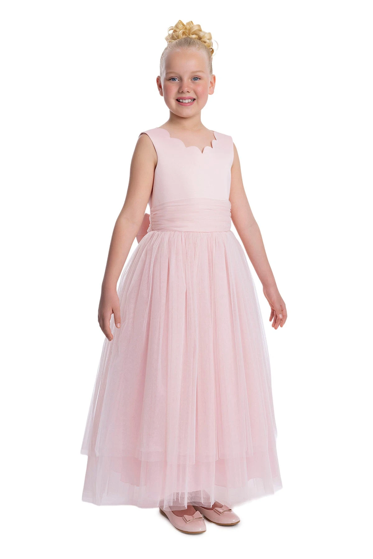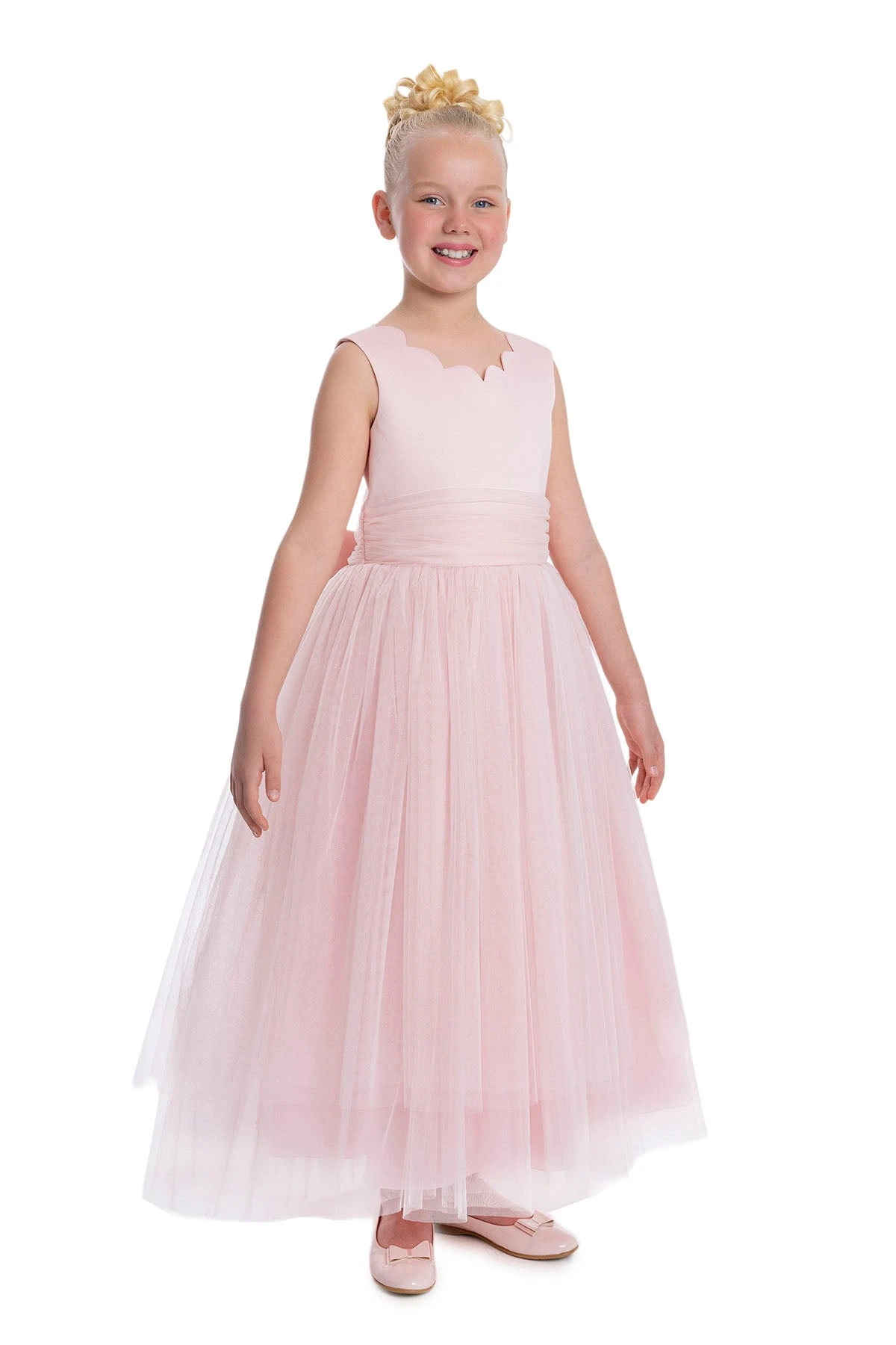 This enchanting Pink Tulle Maxi Dress Long Tutu Dress for Girls is every young girl’s princess dream. Designed with a delicately scalloped round neckline that graces both the front and the back, it exudes a timeless elegance. The satin bodice, paired with a tulle sash at the waist, cascades into a skirt adorned with layers of sparkling, glitter-infused tulle. The dress boasts a voluminous silhouette, thanks to the layers of soft tulle, while the cotton lining ensures it’s comfortable. An oversized, elegant bow at the back provides a stunning focal point. Perfect for birthdays, parties, or any special event, this dress is a stylish statement piece as memorable as the moments it’s worn in.