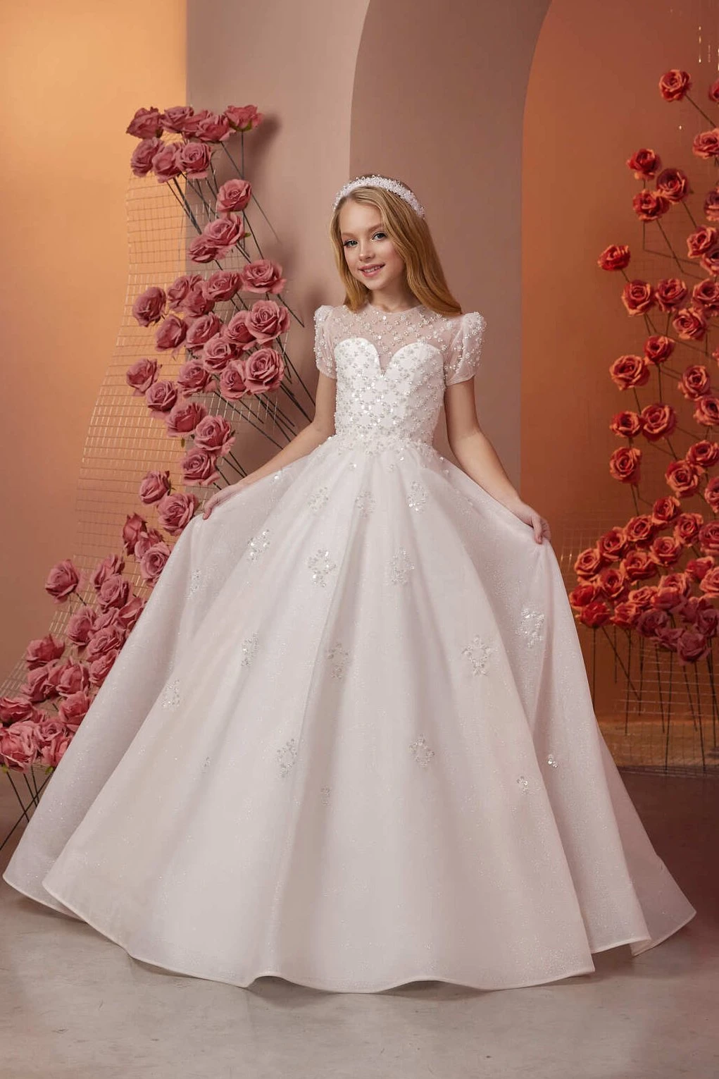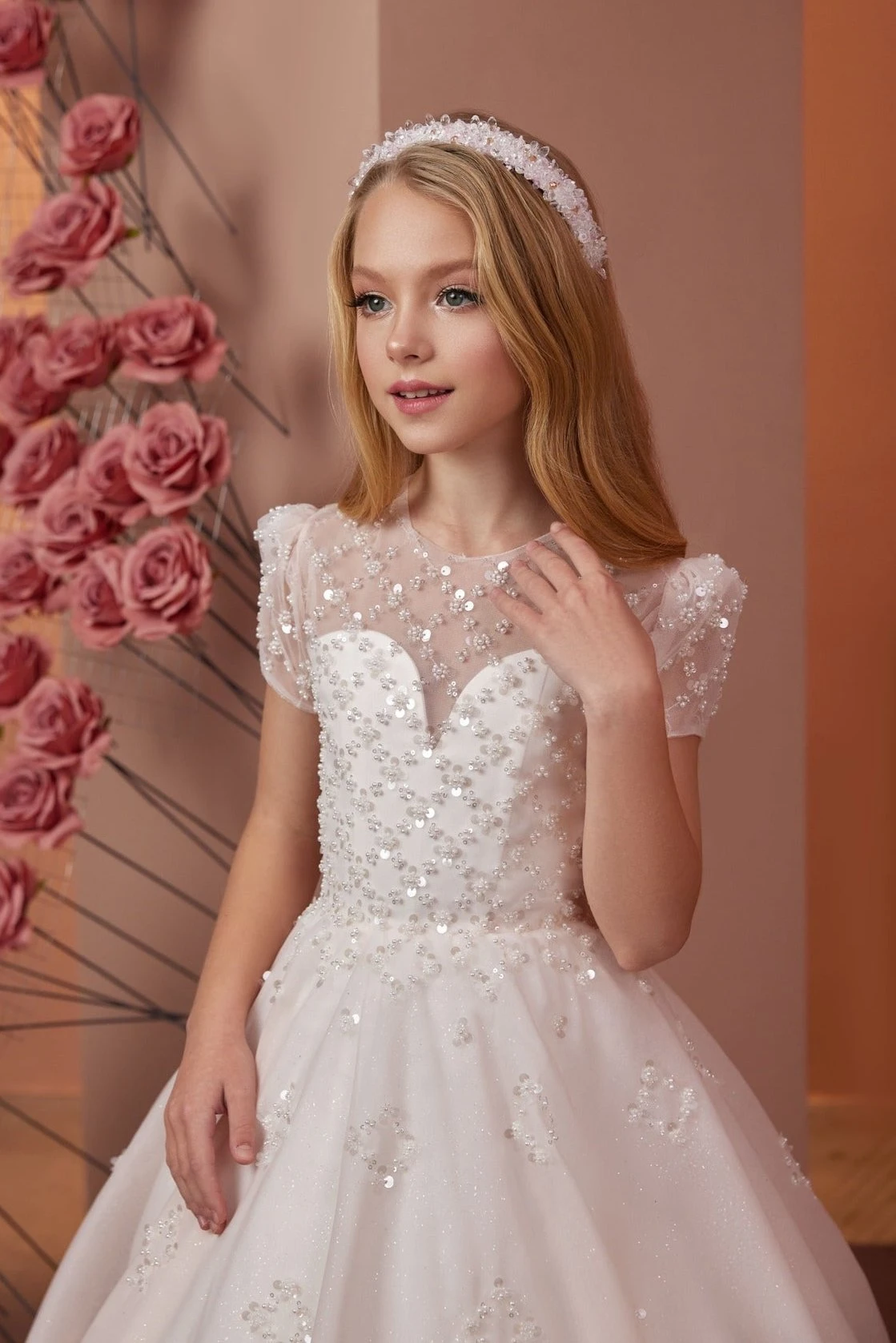 This exquisite Radiant Heart-Shaped Elegance Dress is a true testament to romance and glamour, dazzling with its array of shiny beads and sequins. The heart-shaped corset adds a deeply romantic touch, accentuating the bodice with its enchanting design. Puffy shoulders enhance the overall silhouette, adding a playful yet sophisticated flair. The skirt features a layer of sequins that catch the light with every movement, ensuring the dress sparkles with every step. Stylish applications from the corset gracefully cascade onto the skirt, creating a seamless and chic look. The back is adorned with elegant lacing and a series of satin summarys, providing both a secure fit and an extra touch of sophistication. The skirt, complete with a small train, adds a beloved finishing touch, making this dress a popular choice among our young princesses.