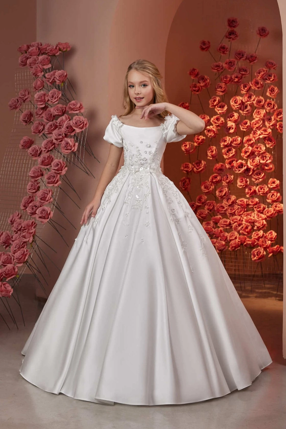 This Regal Satin Elegance Dress is a true testament to luxury and sophistication, crafted from opulent satin that exudes a timeless allure. The striking boat neck corset showcases bare shoulders in an eye-catching design, favored by fashionistas for its contemporary elegance. Delicate flower-adorned hangers enhance the outfit’s refined charm, adding a touch of delicate grace. The long skirt cascades in symmetrical folds, adorned with shimmering sequins and beads that catch the light with every movement, creating a dazzling effect. The back of the dress is meticulously finished with a high zipper and wide lacing, allowing for an adjustable fit that ensures comfort and perfect fit. A chic, flowing train completes the ensemble, adding a final, enchanting flourish that embodies the essence of a modern-day princess.