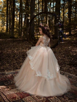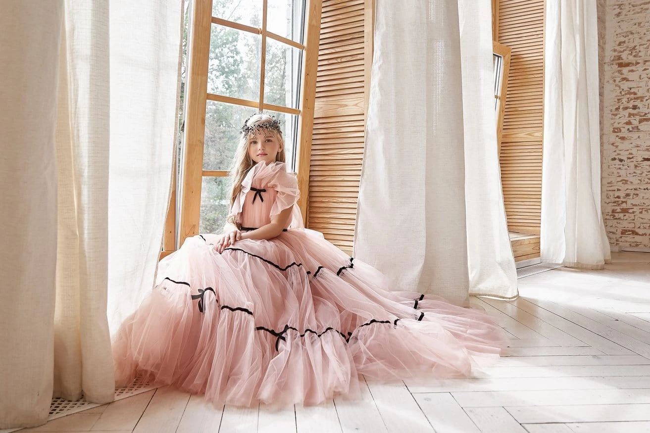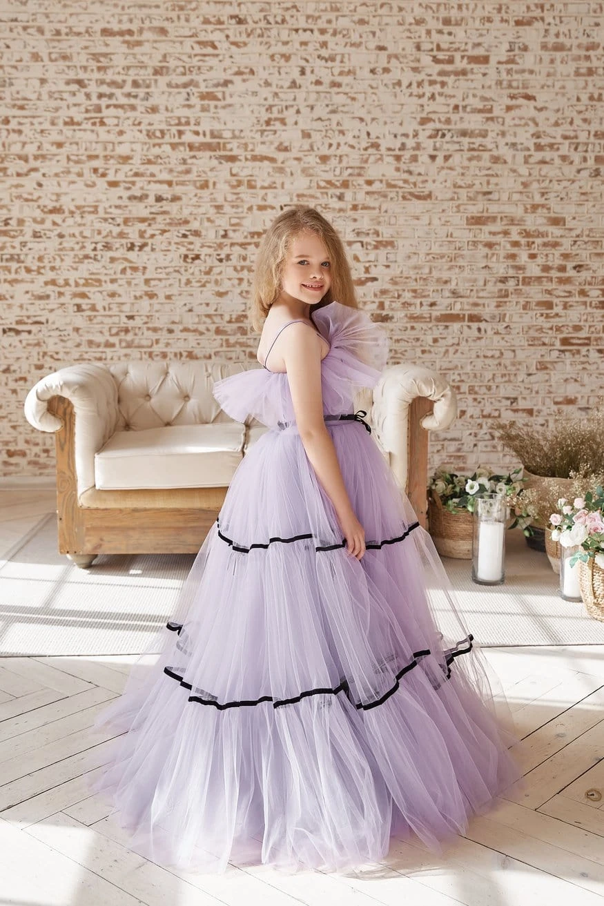 A tulle flower girl dress with ruffles around the neckline by Mia Bambina Boutique Canada is so sweet! This gorgeous style is a floor-length ball gown notable for its incredible multi-tiered layered tulle skirt. The stunning pastel color palette is complemented by thin black ribbons on the skirt and around the waist. An additional crinoline underskirt can be ordered for ultimate fullness.