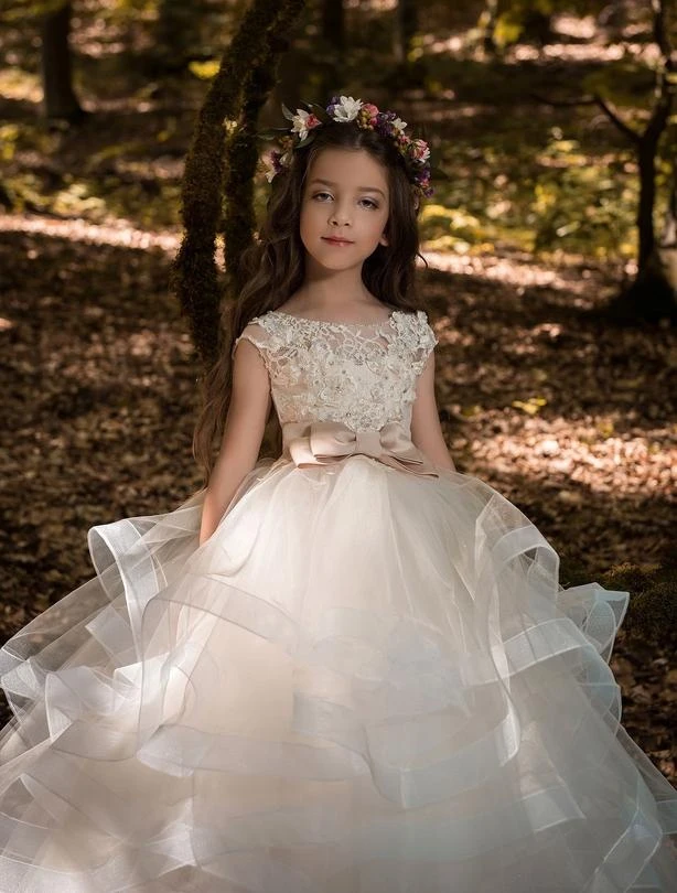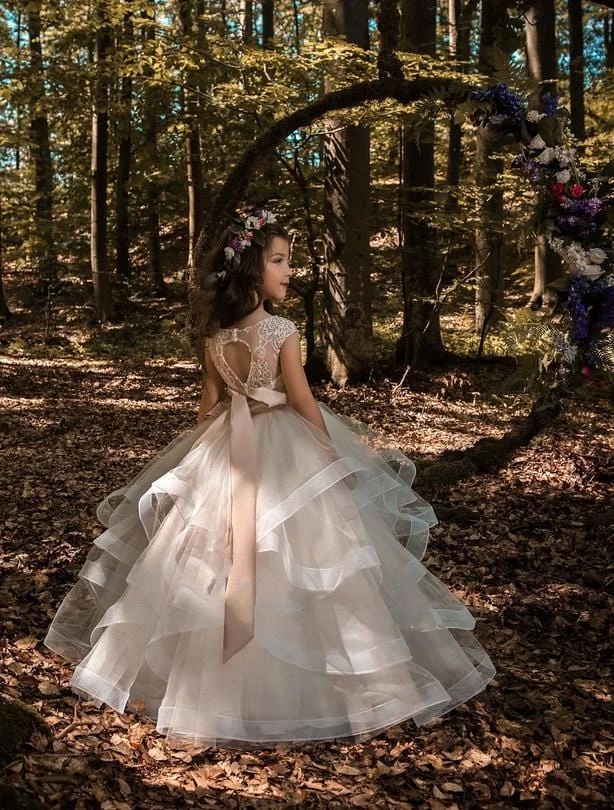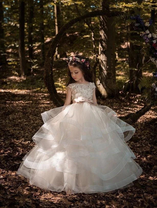 The Salamanca Flower Girl Dress For Wedding by MB Boutique Canada. Our beautiful girl’s dress is perfect for parties, occasions, birthdays, and photoshoots. This white luxury gown is fit for a princess with a fully embellished bodice that features floral and rhinestones appliques and a full long ruffled skirt. The voluminous dress features rows and rows of horsehair braid that gives it a perfect lift. At the back, there’s an elegant cut-out and corset closure.
