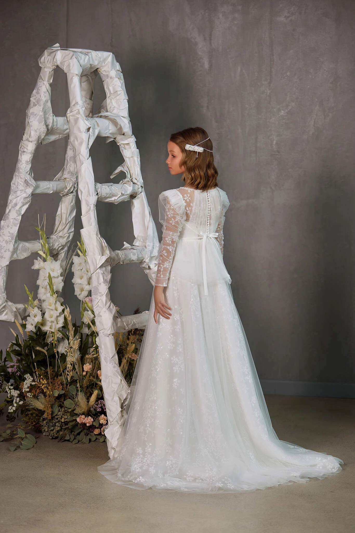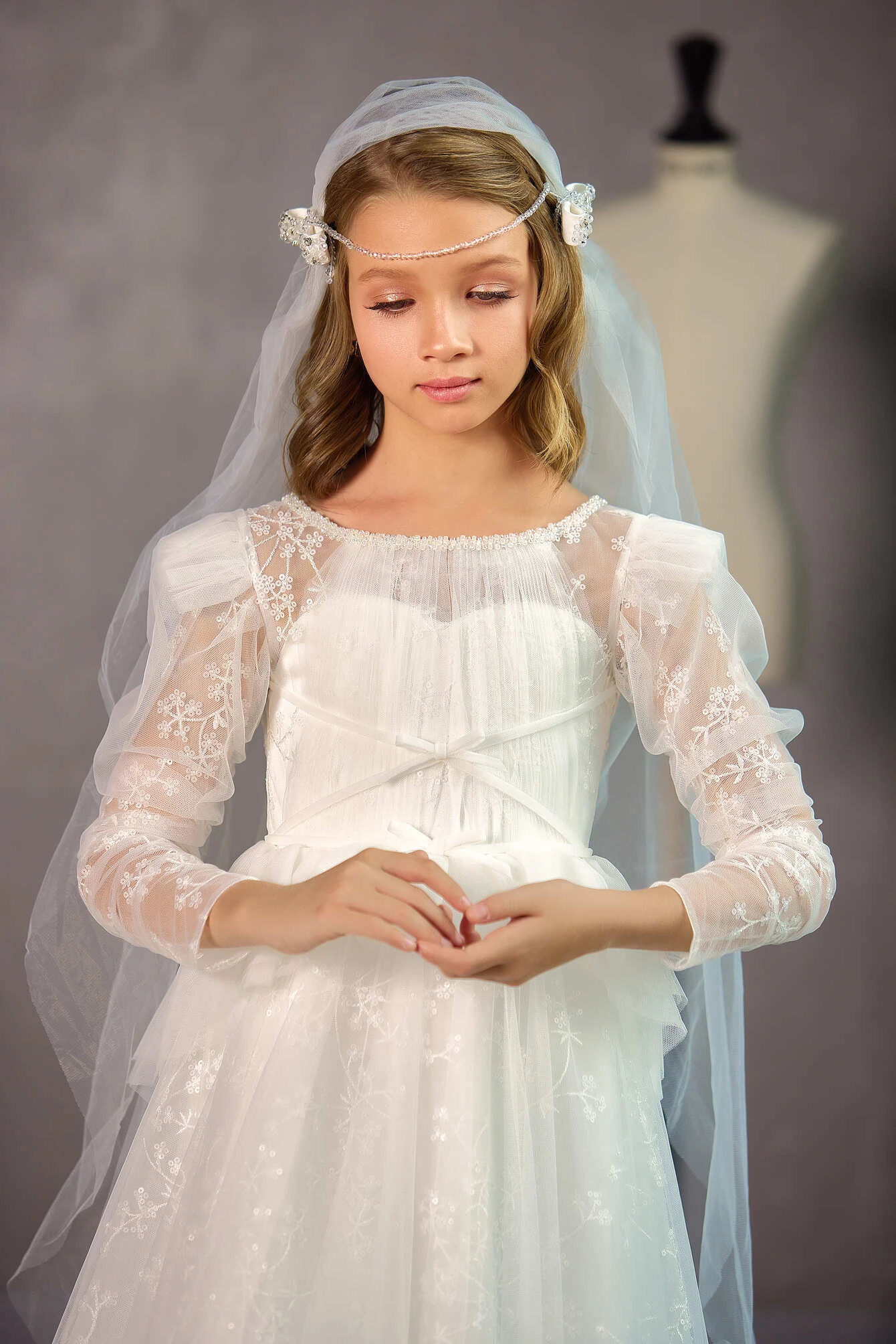 A CHARMING COMMUNION DRESS WITH INTRICATE DETAILS CREATES AN ETHEREAL LOOK FOR HER SPECIAL DAY.