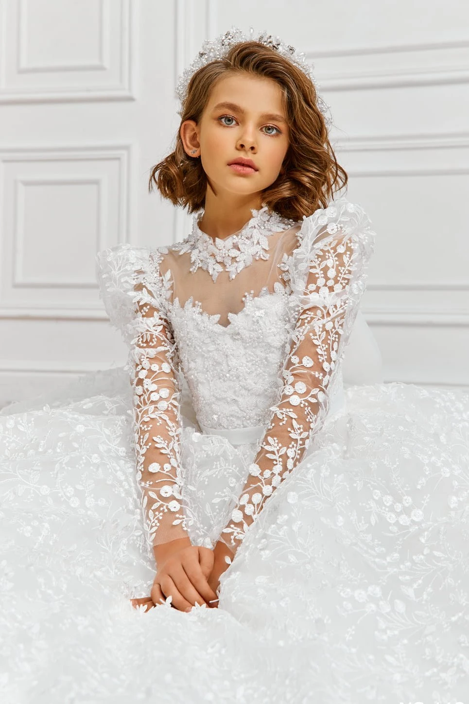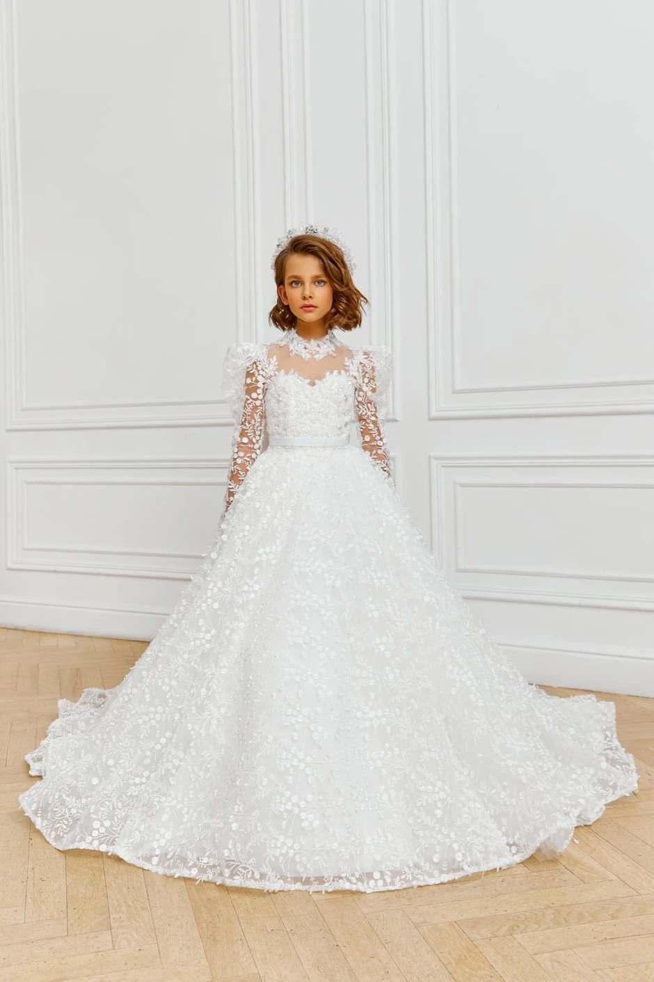 Elegant long sleeved 1st Communion dress features beaded textured lacework on top with an high lace illusion neckline and an adjustable corset back. Gorgeous, voluminous flowers adorn the bodice and appear on the hemline. The finest tulle stiffens the underskirt. The perfect princess dress for any little Flower Girl or formal event.