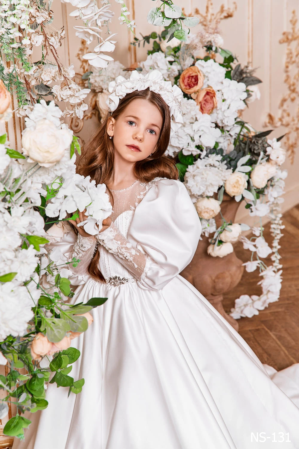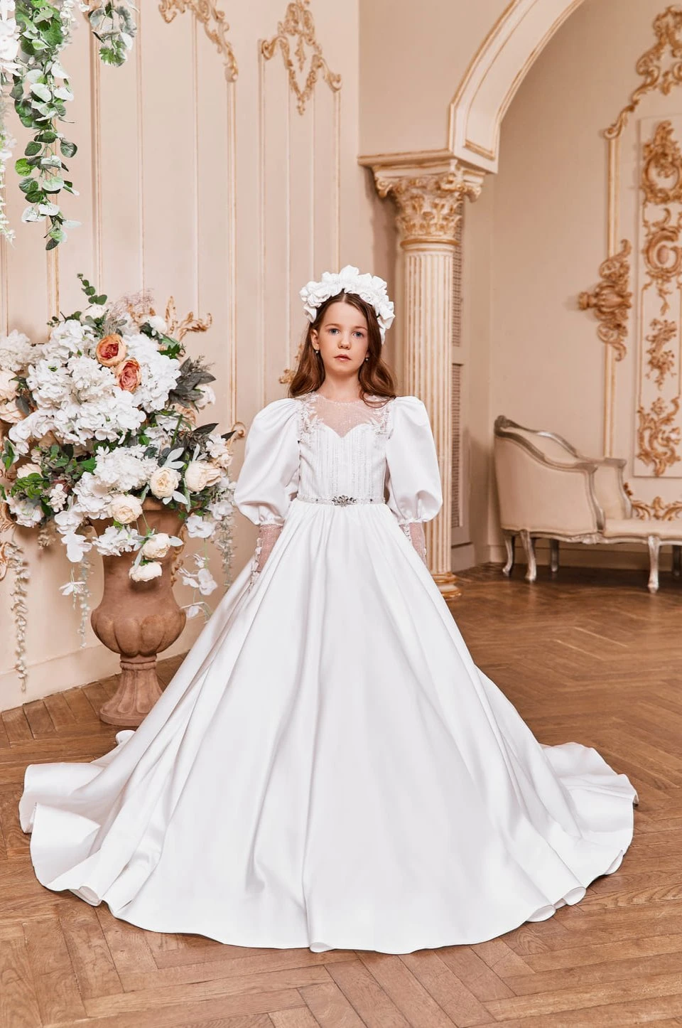 Elegant satin Communion dress with bishop sleeves and a sweetheart corset. The illusion neckline and semitransparent back add a touch of sophistication, while the bishop sleeves with lace embroidered cuffs make for a regal look. Perfect for a royal celebration.