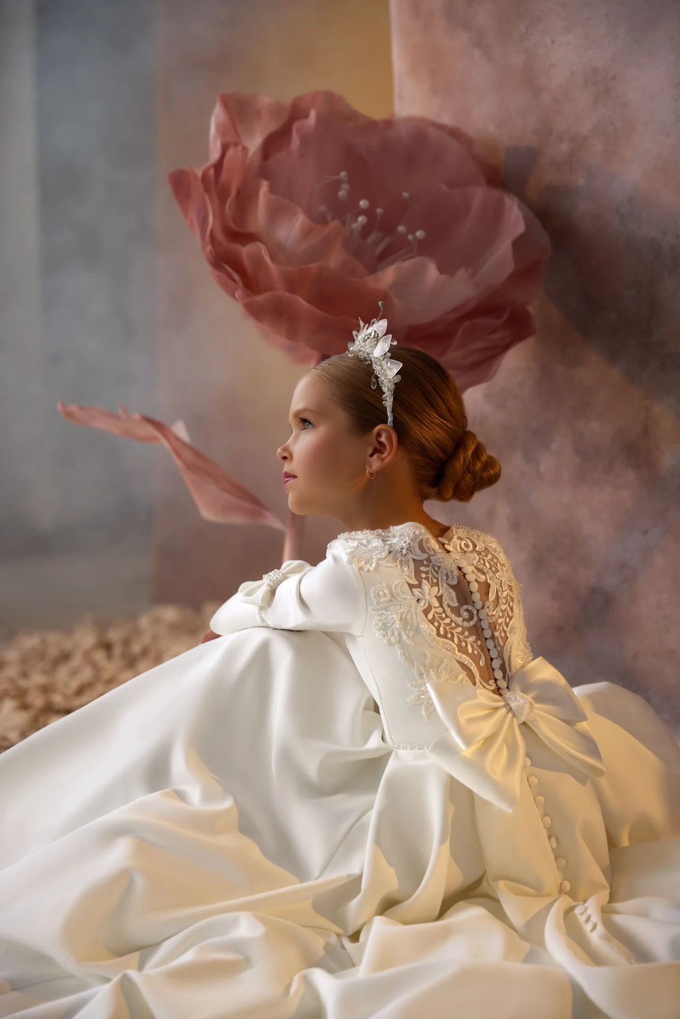 The Saving Grace Communion Gown captures the essence of timeless elegance, perfect for a reserved and traditional First Communion. This sophisticated communion gown features a high collar and long sleeves, each adorned with a charming bow and a delicate open detail at the base, reflecting a classic, vintage style.