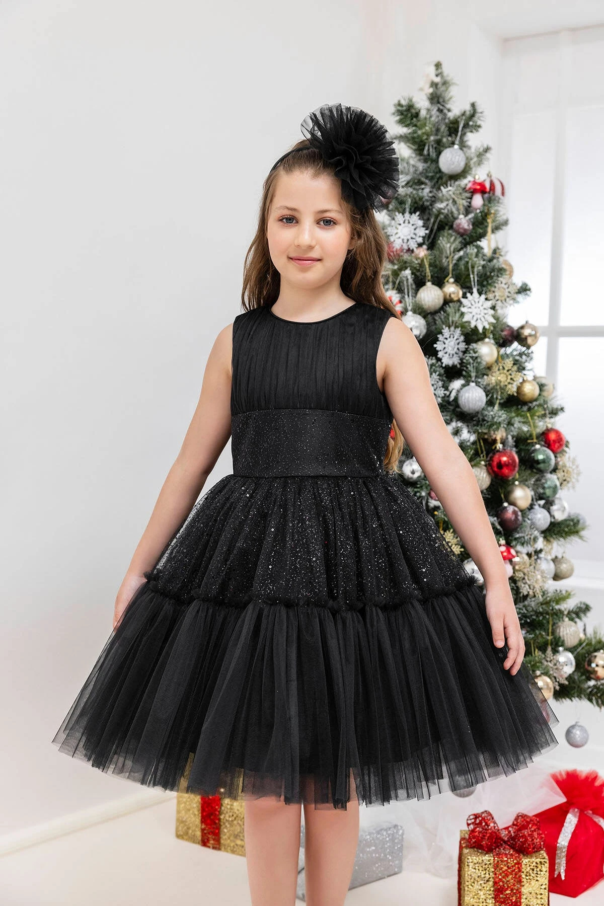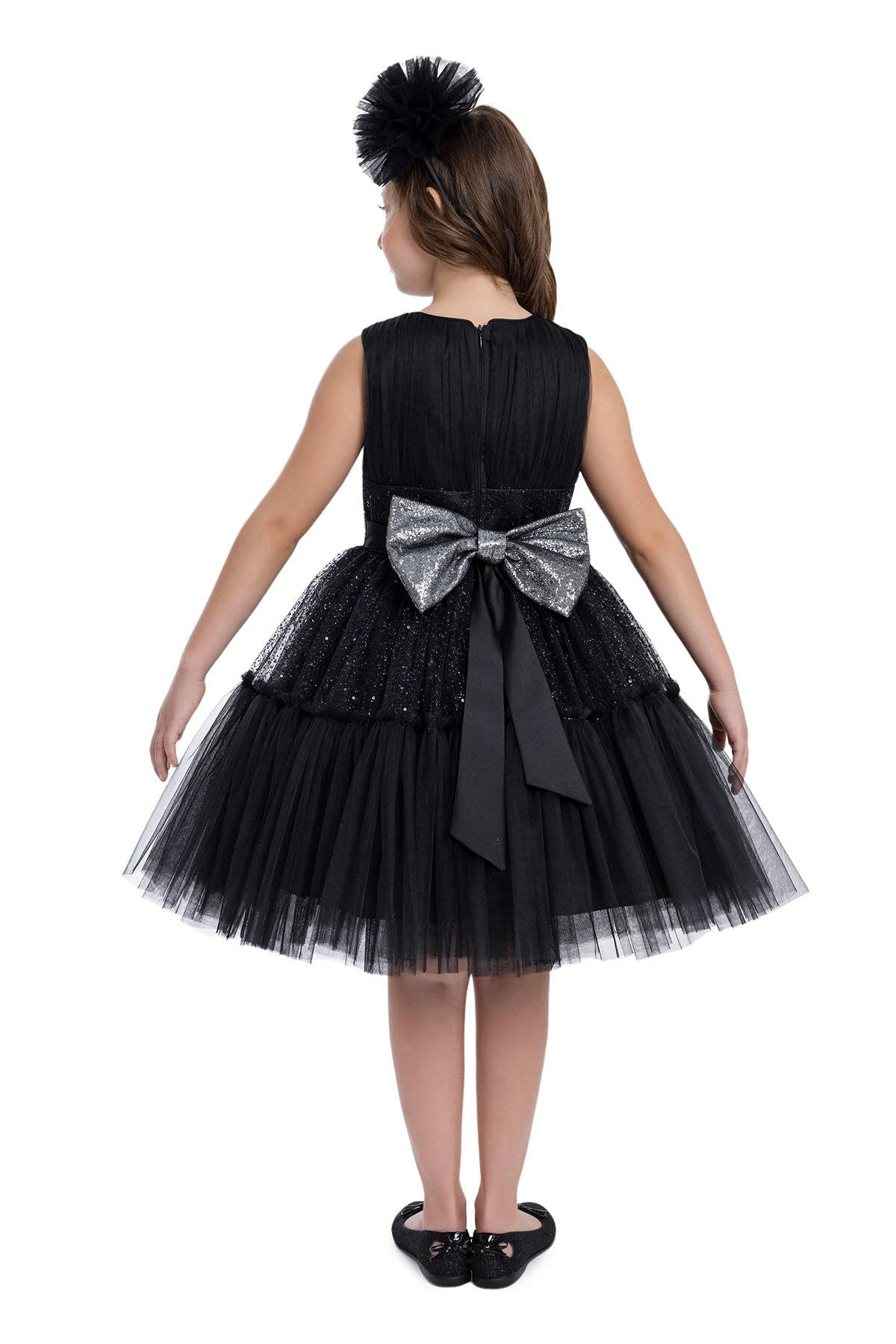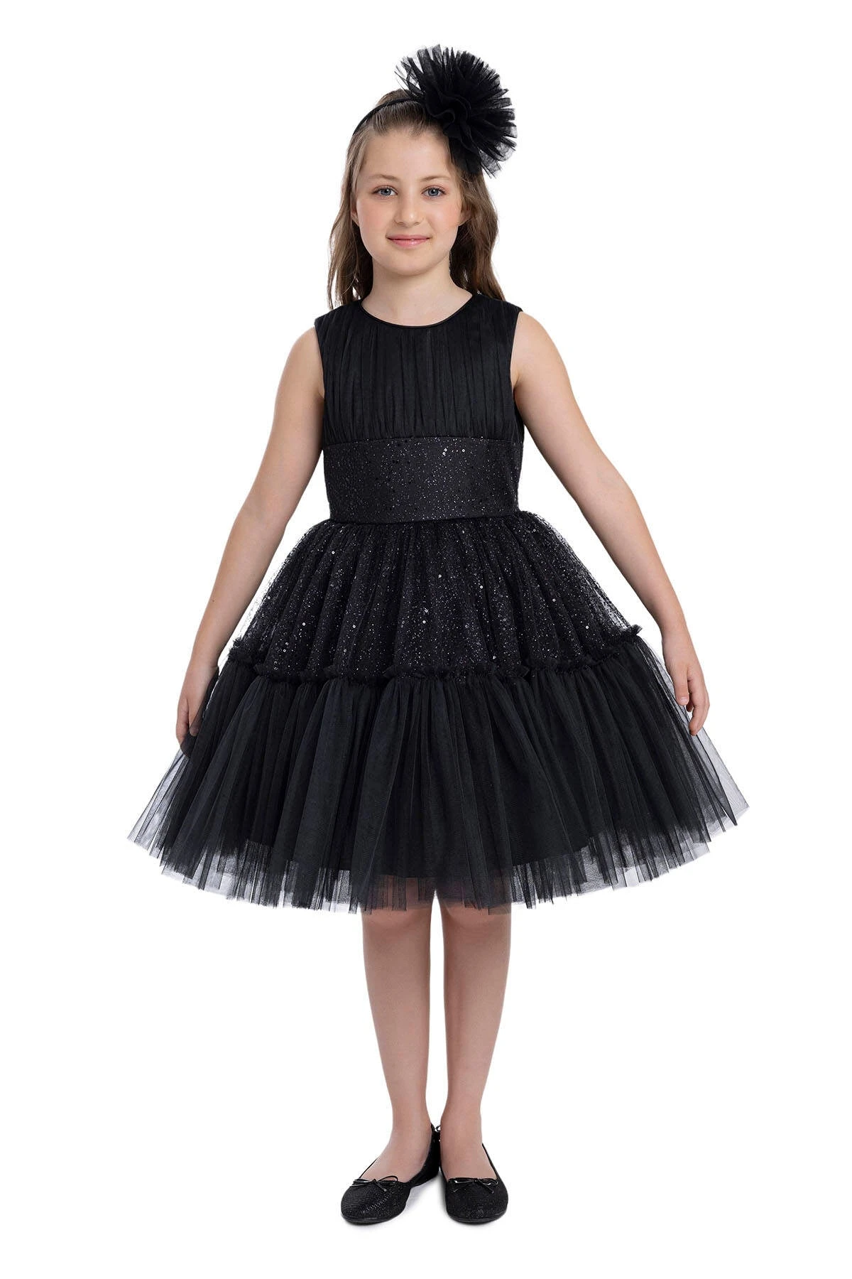 The elegant black sleeveless dress is suitable for young girls. It features a sleeveless bodice with vertical pleats. The waistband is accentuated with a sparkly, sequin-embedded band. From the waist down, the dress transforms into a voluminous tutu-style skirt composed of several layers of black tulle, also adorned with glittering sequins to give the dress a starry, shimmering effect. The dress has a detachable shiny bow at the back. The skirt’s tulle overlay appears soft and floats away from the body, providing a classic princess silhouette. Completing the outfit is a large, decorative black pom-pom hair accessory, adding an extra element of sophistication to this festive look. A stylish choice that can be used as a birthday dress, party dress, or special occasion dress.