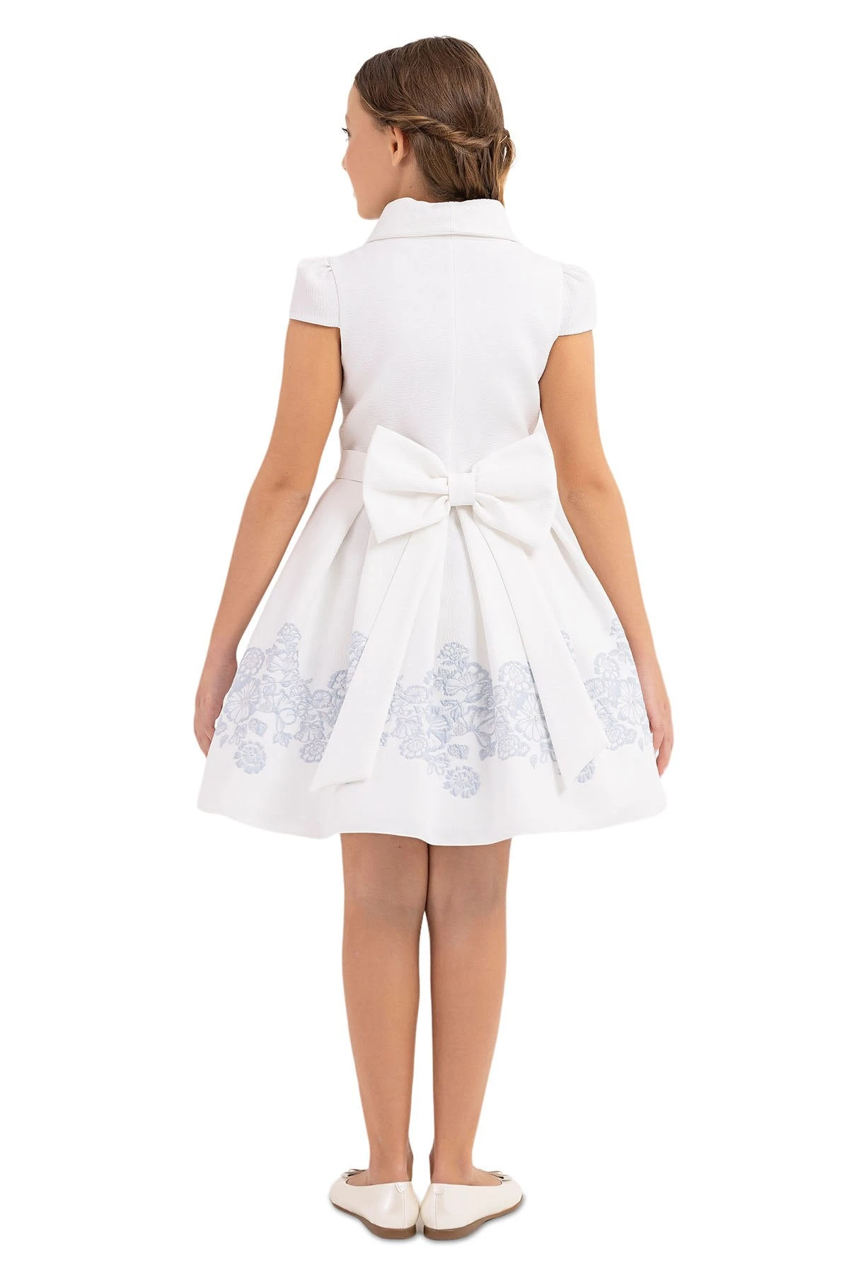 Teen Girl Semi-Formal Dress with Scarf Collar and Blue flowers is the perfect look for Easter, birthday party, spring, and any special occasion, or wedding. The teen dress comes in beautiful pastel colour and compliments any special occasion or photoshoot. It has a shawl collar neck and cup sleeves. The outfit looks chic and feels comfortable! Perfect for flower girls, pageants, birthdays, and other special occasions. Its full skirt with flounce has layer of stiff tulle underneath. It fastens with sash ties and concealed zip at the back.