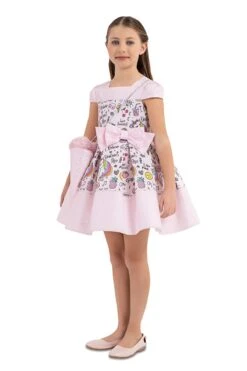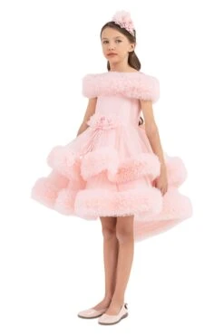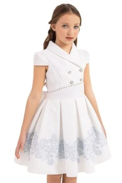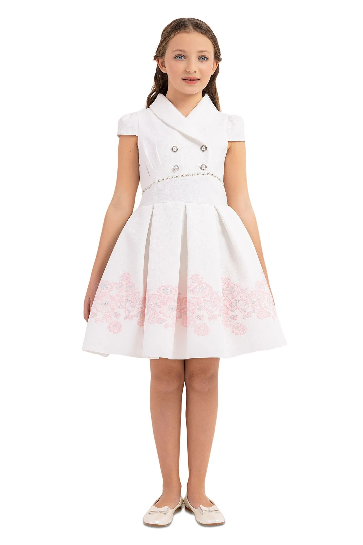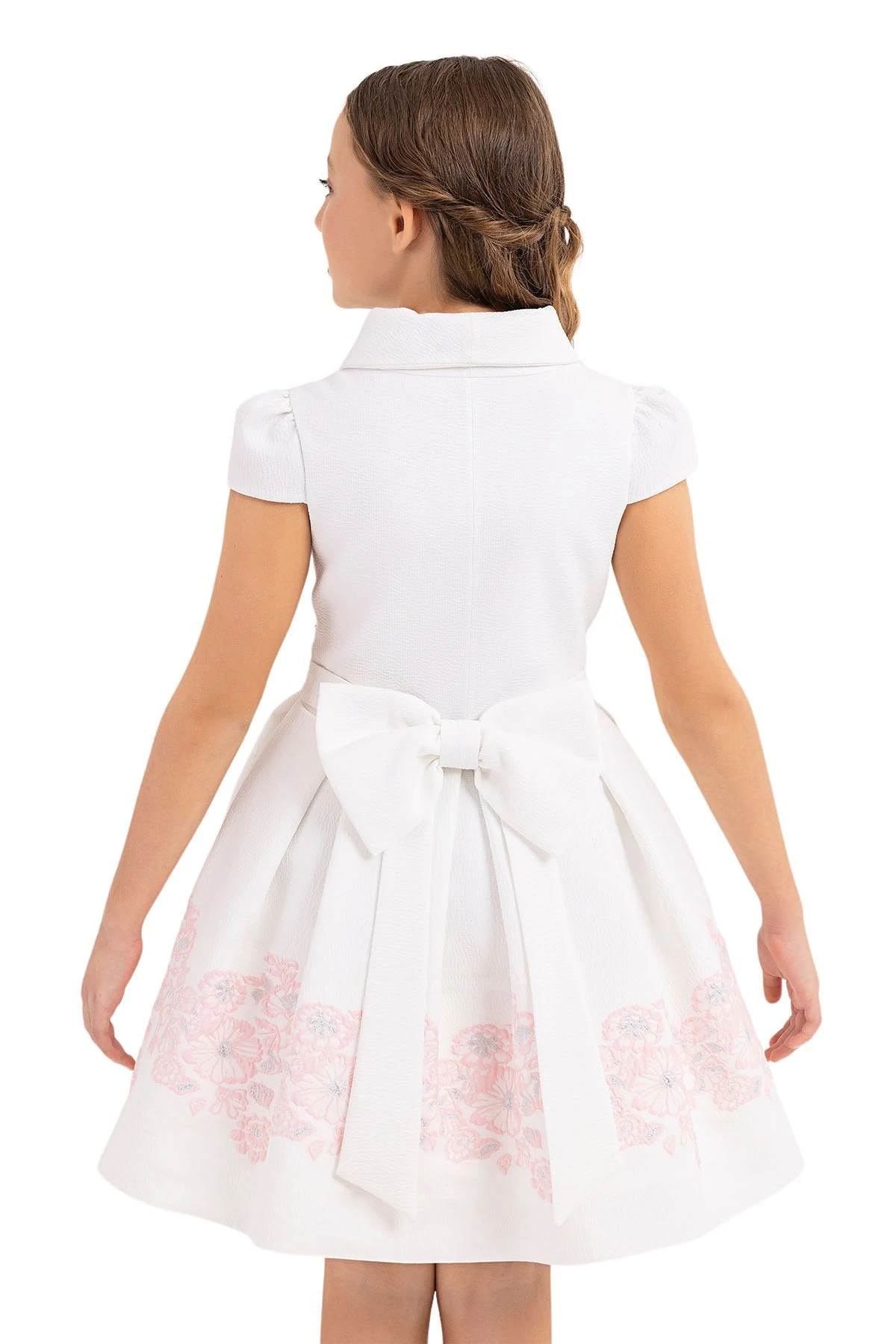 Teen Girl Semi-Formal Dress with Scarf Collar and Pink flowers is the perfect look for Easter, birthday party, spring, and any special occasion, or wedding. The teen dress comes in beautiful pastel colour and compliments any special occasion or photoshoot. It has a shawl collar neck and cup sleeves. The outfit looks chic and feels comfortable! Perfect for flower girls, pageants, birthdays, and other special occasions. Its full skirt with flounce has layer of stiff tulle underneath. It fastens with sash ties and concealed zip at the back.