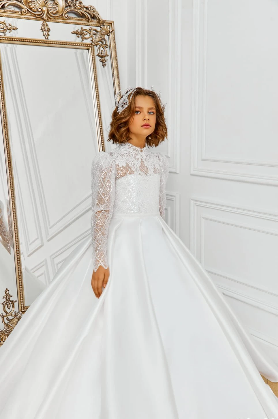 This chic Toronto flower girl dress is a long satin flower girl ball gown for vintage-inspired weddings. It features a long-sleeved top embroidered with textured lattice lace all over. Shining sequins make the top sparkle even brighter. At the back, a beautiful box-pleated skirt boasts a row of covered summarys streaming down towards the short train, while a lovely sash bow adds a finishing touch.