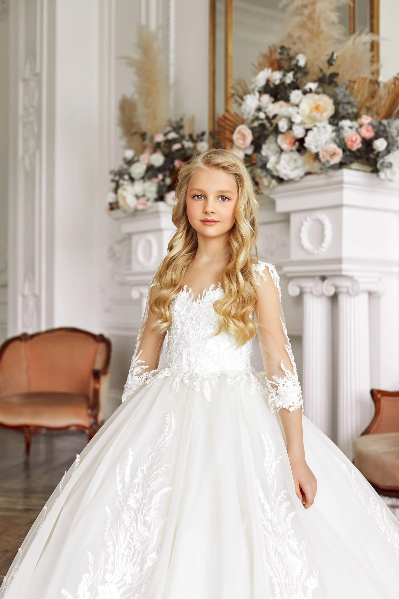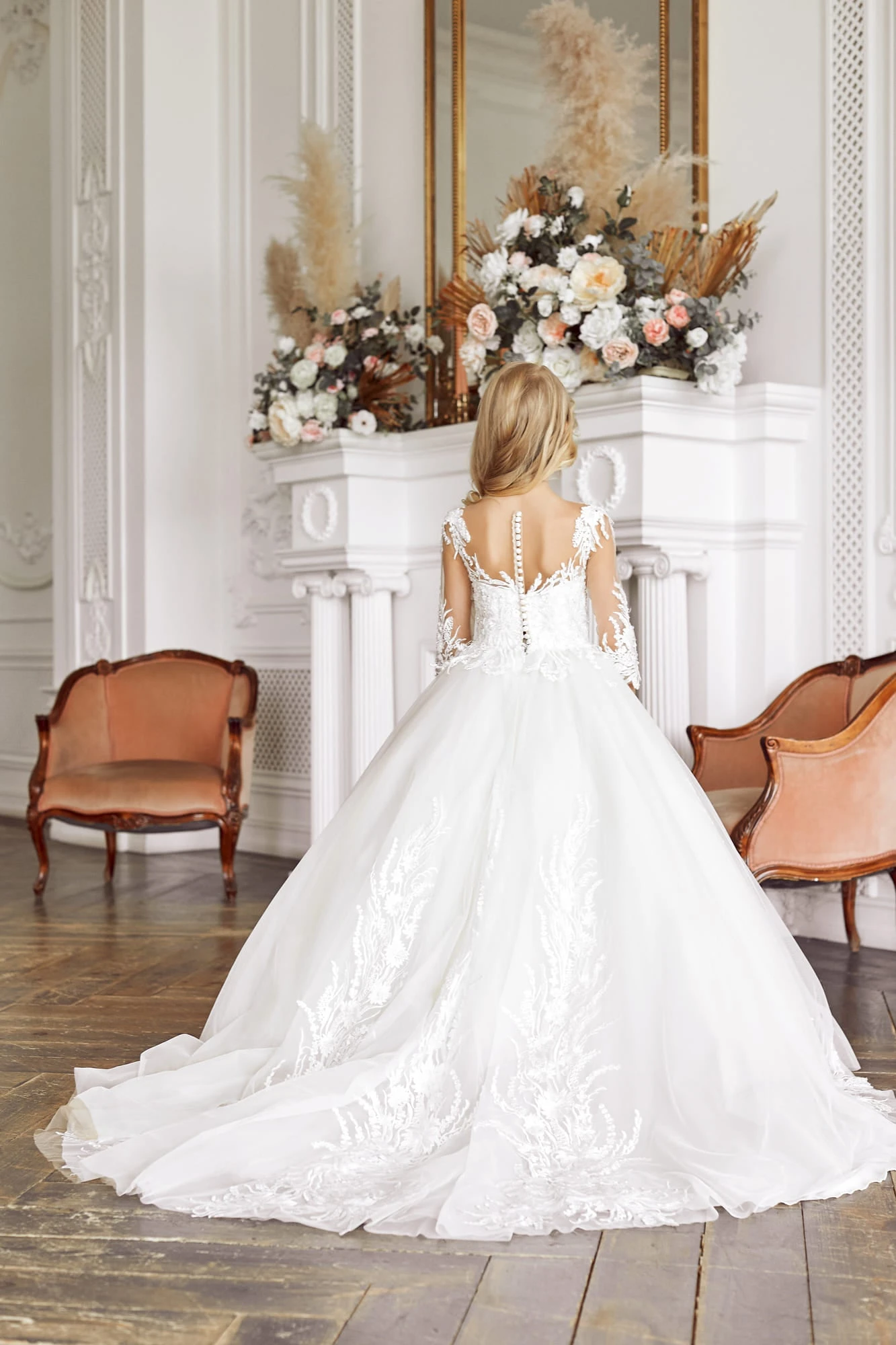 The Traditional Catholic First Communion Dress with Sheer Sleeves is a floor-length ball gown for girls. Illusion neckline and richly embroidered bodice features rhinestone and beads beading throughout, a open net back with summary down closure, and a lace-up corset back with a hidden zip-up closure. A puffy multi-layered tulle skirt with white lace applique vines & blossoms along the hemline surprises with chic detailing at the back.