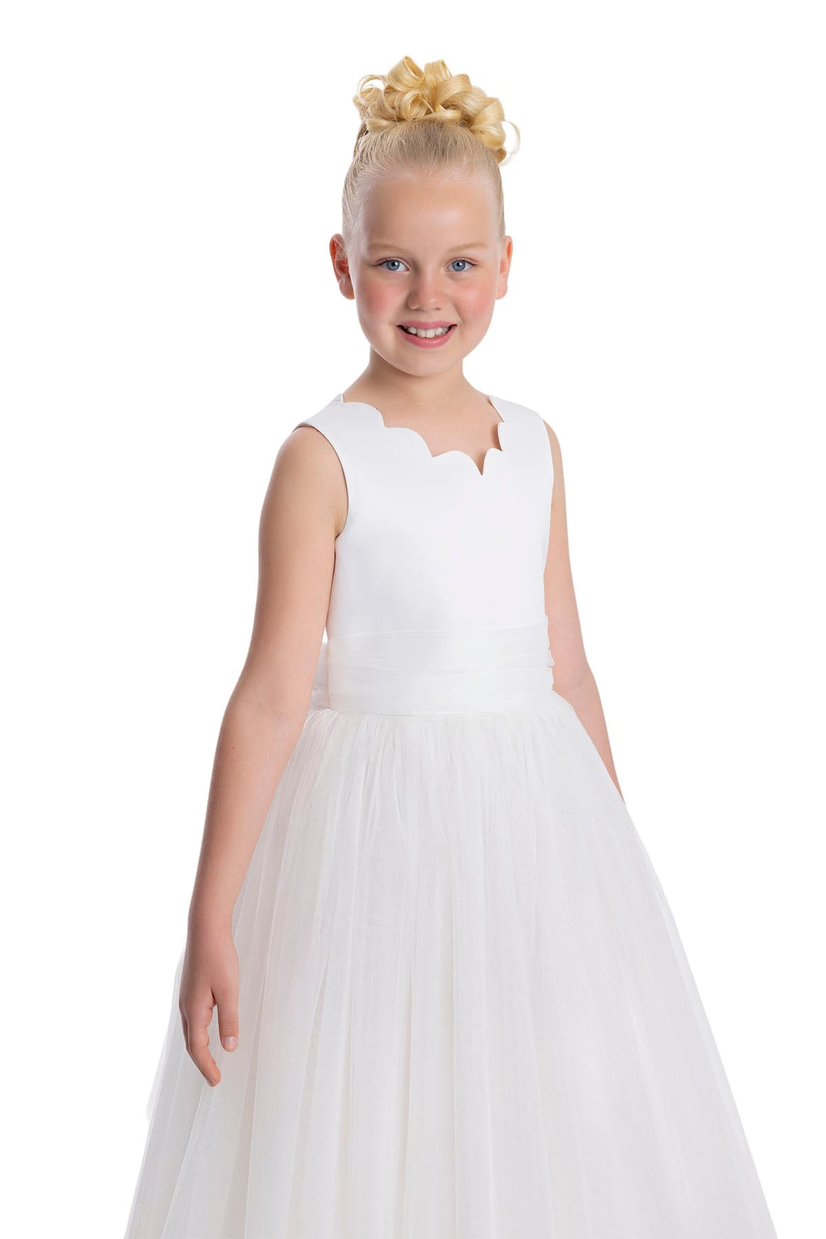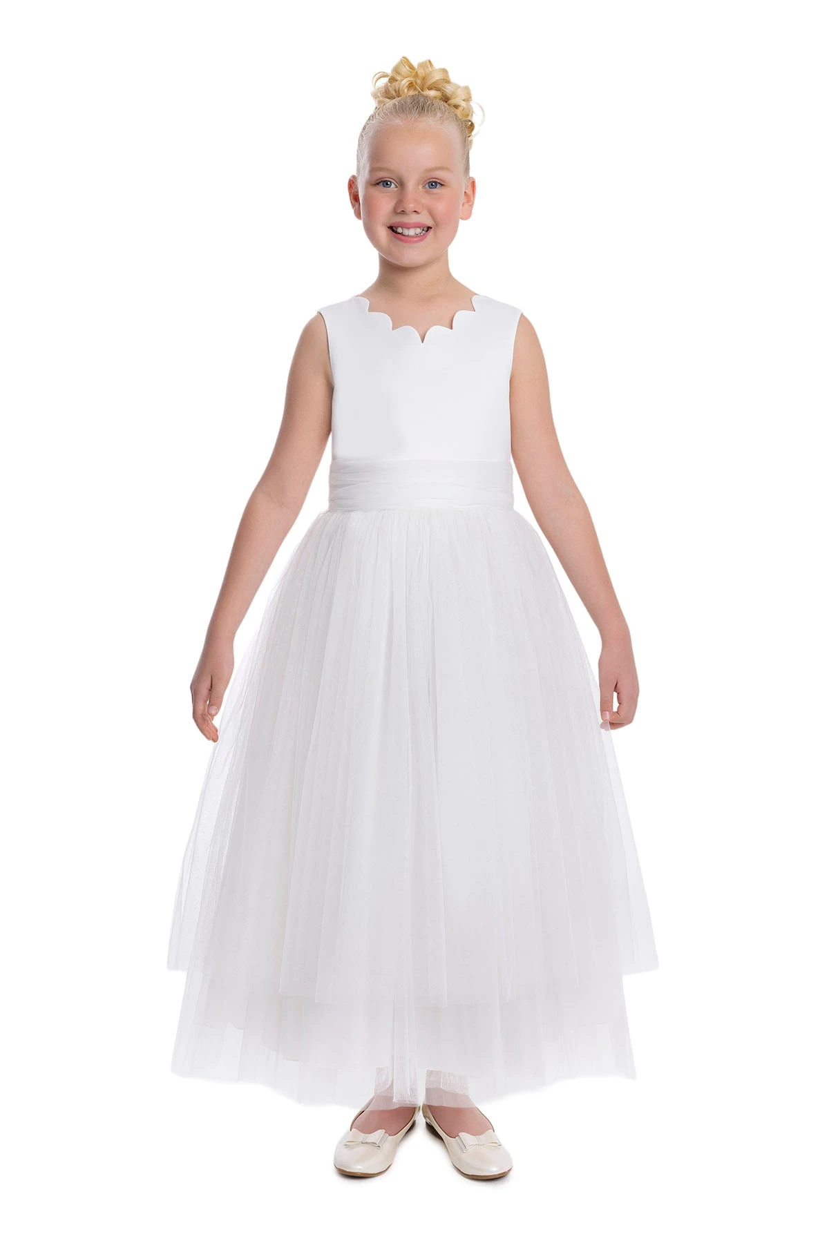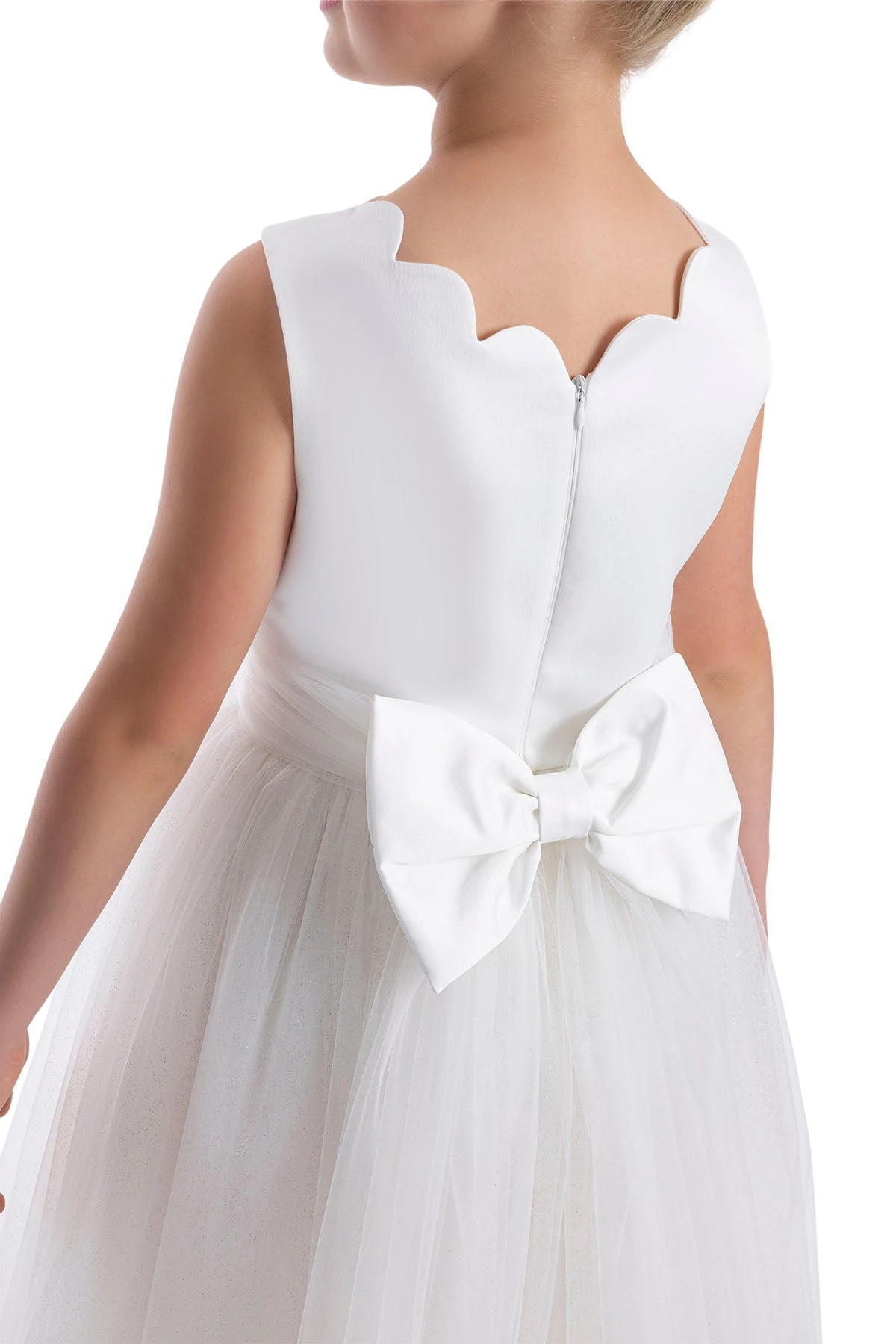 This enchanting white sleeveless Tulle Maxi Dress in Off White Tutu Dress for Girls is every young girl’s princess dream. Designed with a delicately scalloped round neckline that graces both the front and the back, it exudes a timeless elegance. The satin bodice, paired with a tulle sash at the waist, cascades into a skirt adorned with layers of sparkling, glitter-infused tulle. The dress boasts a voluminous silhouette, thanks to the layers of soft tulle, while the cotton lining ensures it’s comfortable. An oversized, elegant bow at the back provides a stunning focal point. Perfect for birthdays, parties, or any special event, this dress is a stylish statement piece as memorable as the moments it’s worn in.