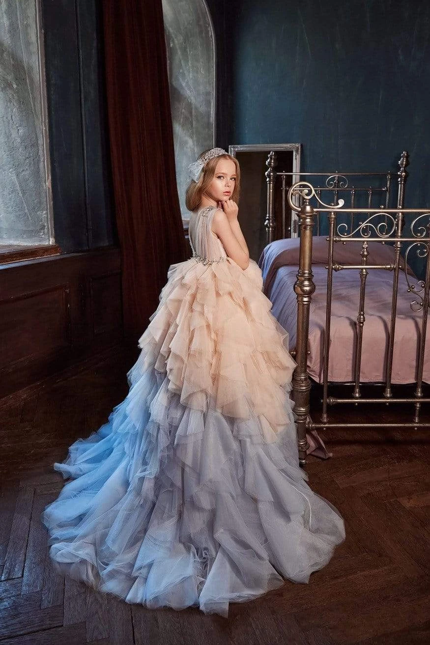 An elegant ombre birthday dress with a fitted illusion bodice has a tiered flounce skirt in the finest contrasting tulle. Adorned with jeweled floral lace appliques on the waist and one shoulder, this is the perfect flower girl, or kids dress for a birthday party or pageant. The two-tone pastel ruffle dress is pure elegance with its exquisite details. The model in the photo wears a multicolored dress.