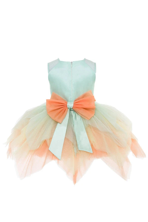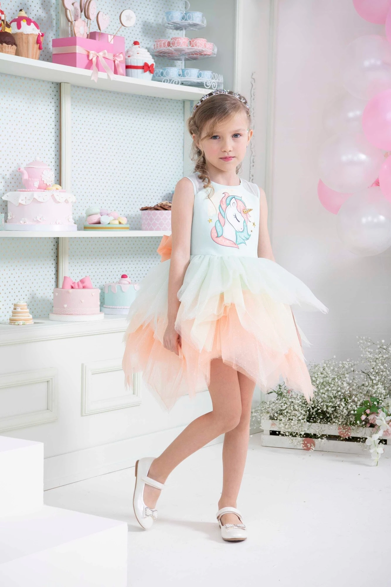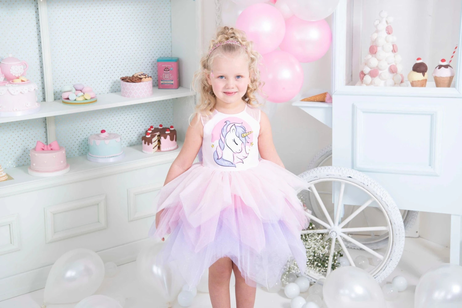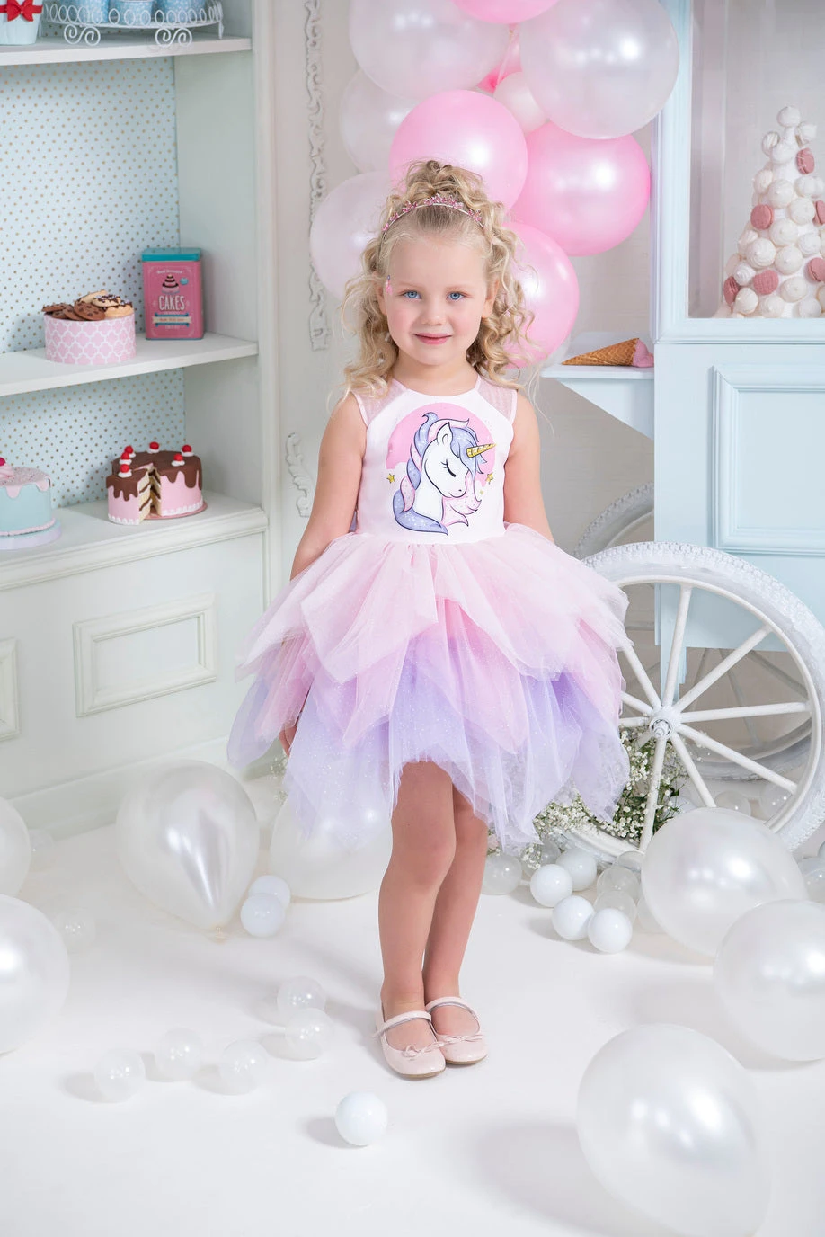 Unicorn Birthday Tutu Dress for Little Girls by Mia Bambina Boutique Canada. This multicolored tutu dress will be a perfect addition to a girl’s unicorn-themed birthday party. Sleeveless tank top bodice with printed unicorn symbol and crystal rhinestones. Pixie cut dress with multicolored tulle sectors sparkles as she twirls. Unicorn Birthday Dress has a zipper closure and an adjustable tulle bowknot on the back. A high-quality garment with cotton lining for extra comfort.