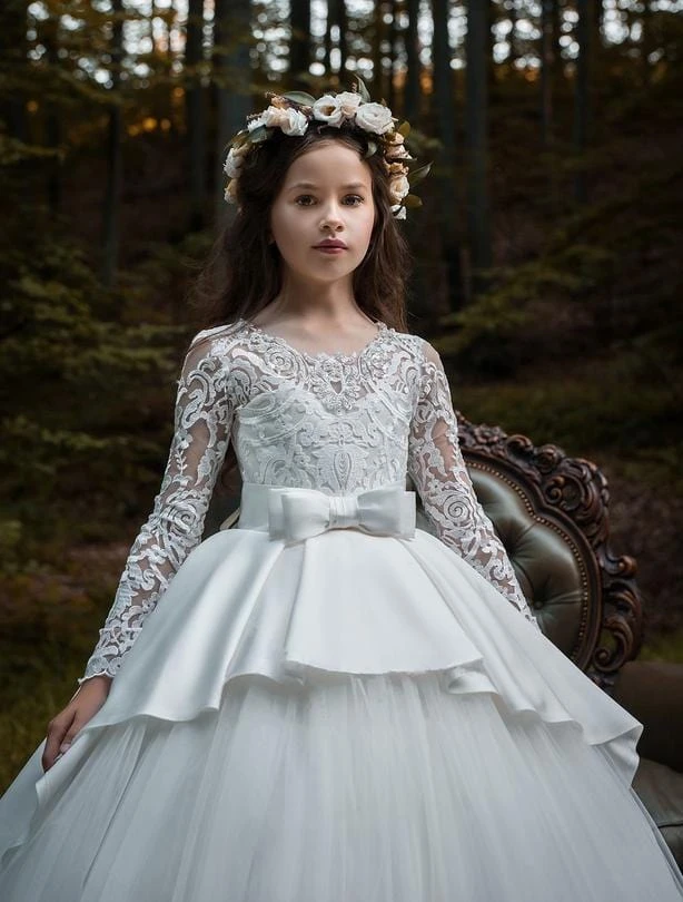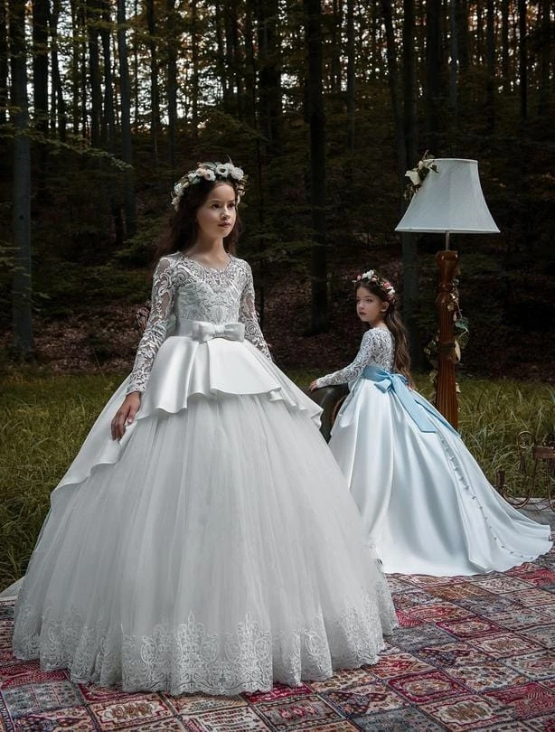 The Venice Royal Ballgown Dress for Flower Girl Dress For Wedding by MB Boutique Canada. The Venice flower girl dress is a stunning ball gown for weddings. The fitted lace bodice features a round neckline and long sleeves. The tulle skirt adorned with delicate lace appliques accentuates a bottom line. A satin overskirt extends into an elegant train and complements the royal style look. A sash with a front bow adds the finishing touch.