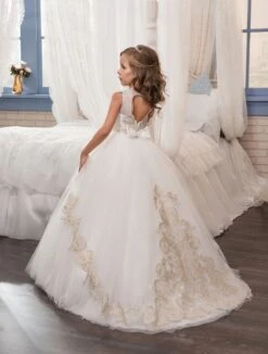 The Verona Flower Girl Dress from Mia Bambina Boutique Canada is perfect for making your little one feel like a princess on your special day. This elegant gown features delicate lace short sleeves and a fitted lace illusion bodice with a sweetheart corset. A sparkling rhinestone brooch accents the waist, while lace appliques decorate the skirt’s hem. The illusion back includes a charming keyhole detail, completing this beautiful flower girl dress with a classic and refined look.