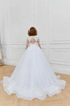 The summary closure at the neck leads to a subtle open-back detail, adding a touch of modern sophistication while remaining modest. A large, delicate bow ties the look together, flowing gracefully into the satin train, while a stunning blossoming flower embellishes the front, symbolizing purity and faith.