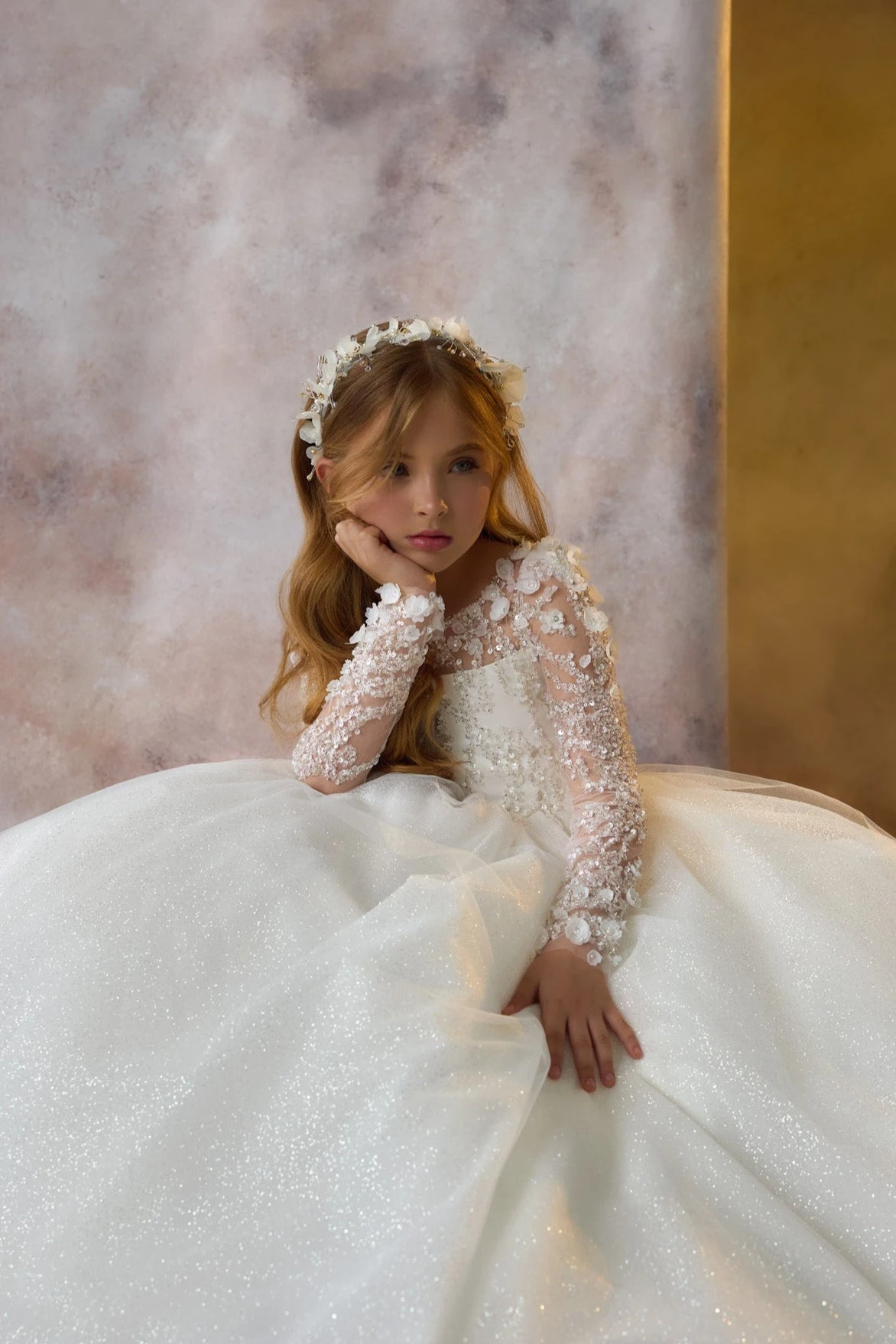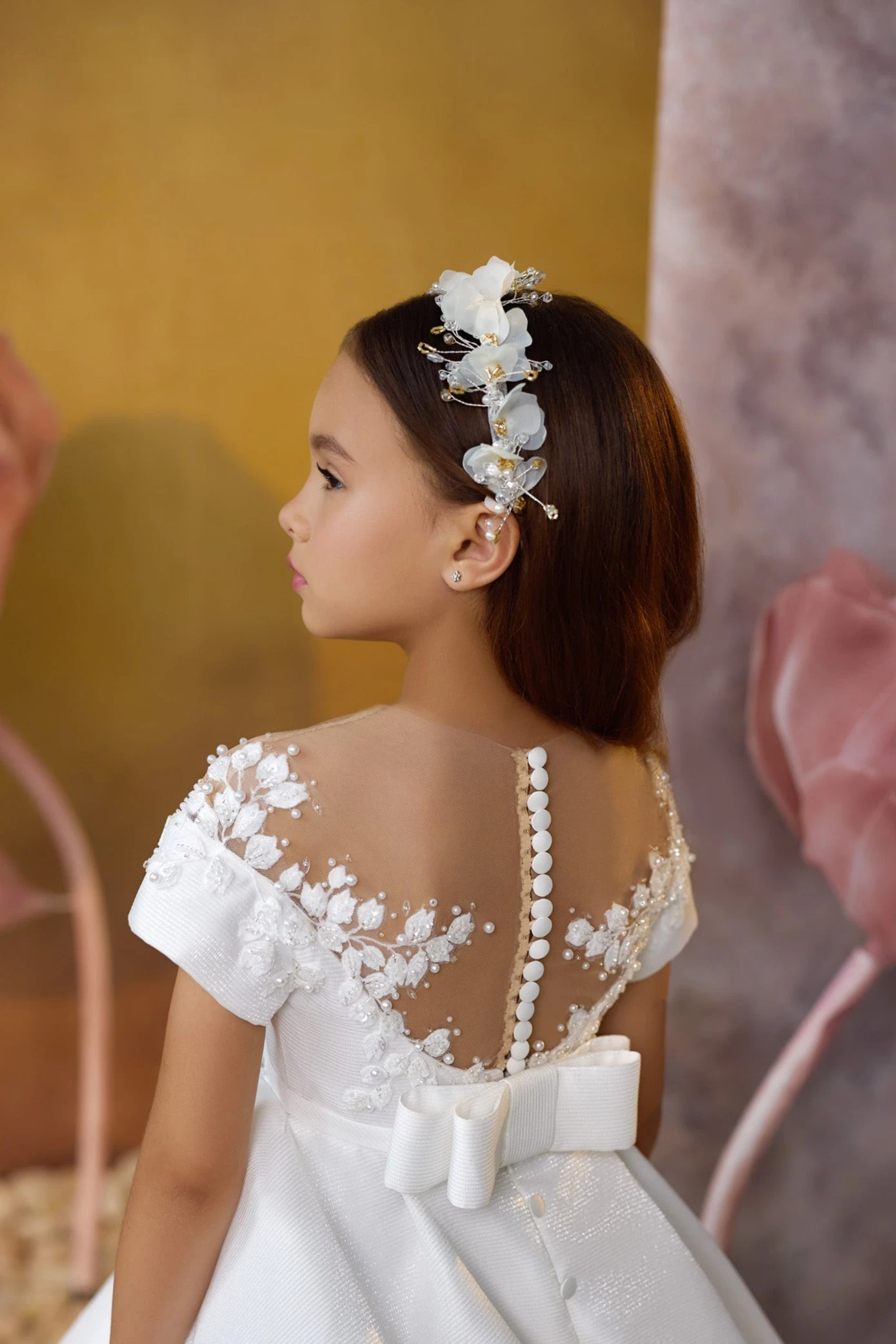 Perfectly designed to crown your little girl’s hairstyle, the flexible band ensures a secure and comfortable fit. Whether worn with cascading curls or a neat bun, this made-to-order accessory complements formal looks such as First Communion dresses, flower girl gowns, birthday ensembles, and more.